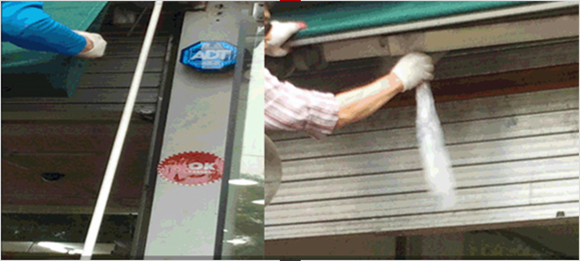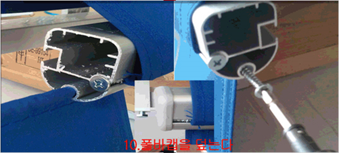 06 원단을 롤러튜브와 풀바 홈을따라 동시에 당긴다.