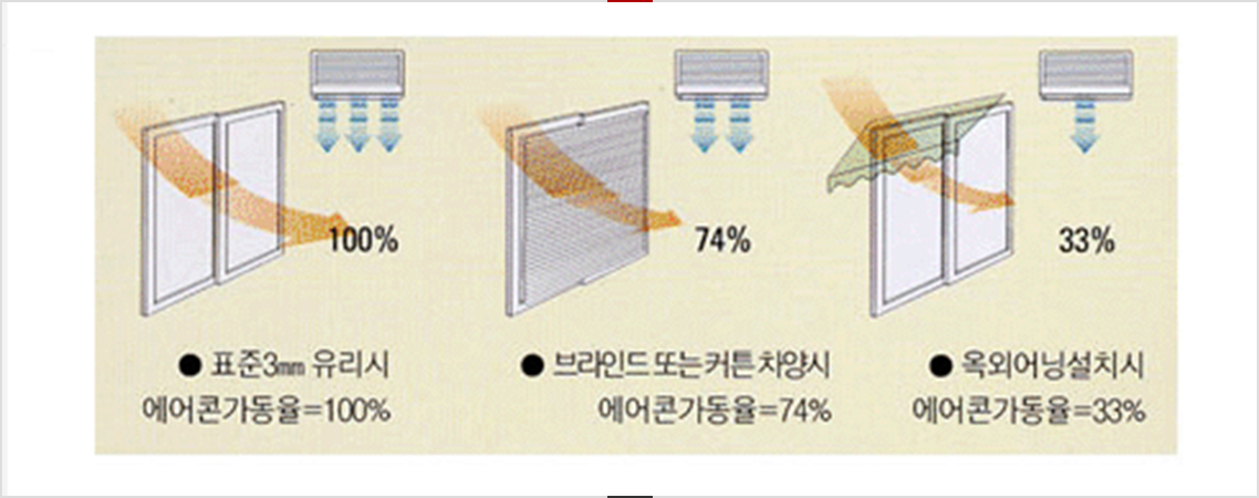 실외에 어닝을 설치할 경우, 여름철 에어컨 냉방비용을 2/3 정도 줄일 수 있습니다.